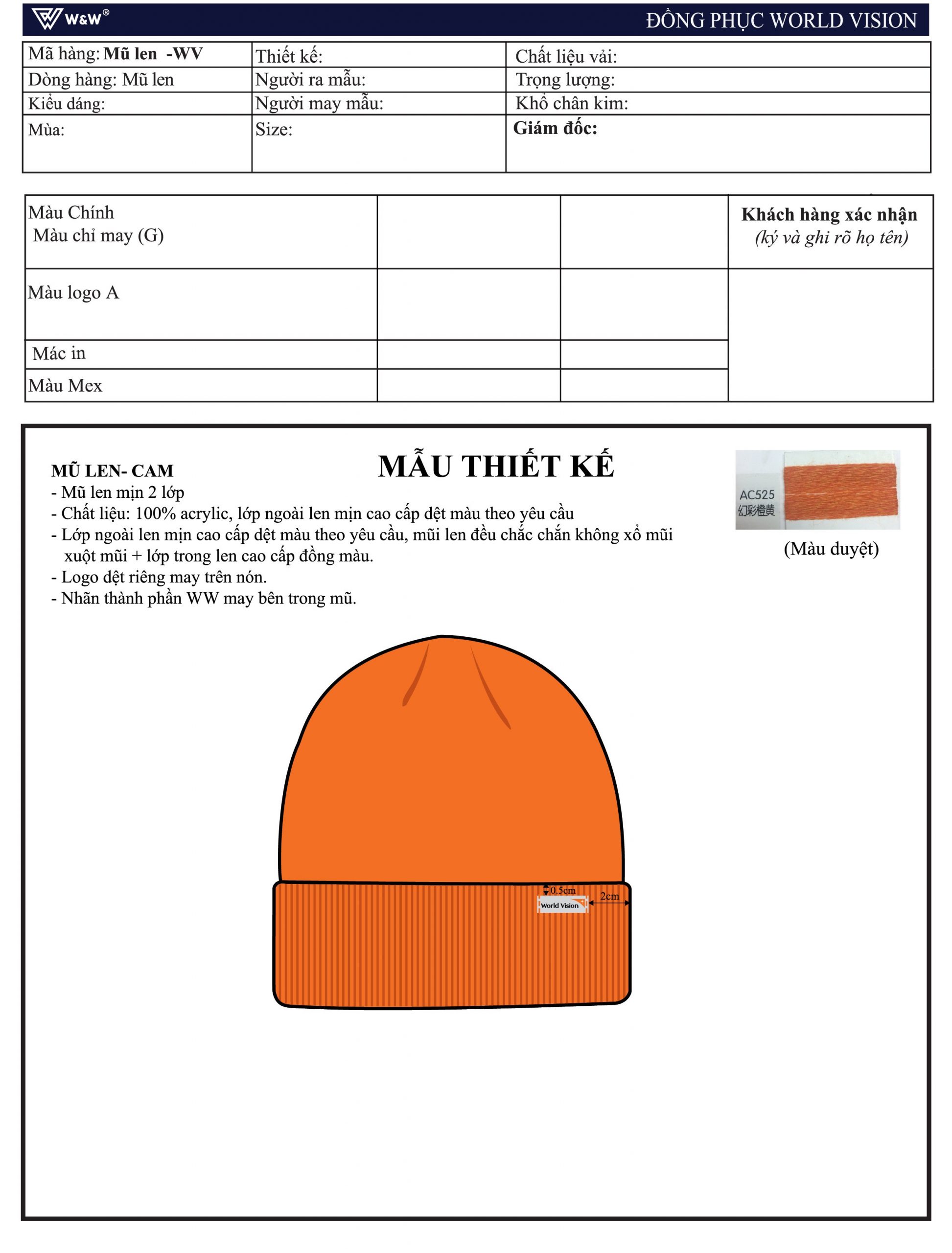 – Logo World Vision Vietnam dệt riêng may lên mũ/nón. Bản thiết kế đính kèm